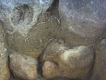 Below is a photograph of the boulders that were part of the wall. You can see the large basalt boulders that form the base of the wall; our excavation unit butts up against them. Within the unit are several boulders that had been buried. Only one, the pock-marked boulder on the far left side of the unit, was fully engulfed by the soils that had slid from farther upslope; it most likely was a part of the wall, but a part of the wall that extends upslope. The other boulders appear to have fallen from the wall immediately adjacent to where they now rest. The sliding soil buried these boulders, but did not transport them as it did the boulder to the far left. Our groundstone tool was found underneath the roundish boulder in the center of the unit.