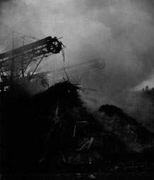 Here, in the hinterparts of the parasitic organism, we can see the extent of the destruction. For a single species of tree the whole of the forest is wasted. The clacking of the conveyors is constant. As the waste piles grow in size and increase in number, one can estimate, not just the rate of loss, but also the size and character of the missing mass. Sitting at a child's toy piano a boreal owl plays an ode to carbon. In a meadow, several critters attempt an interpretive dance, one of them playing the part of the tragic fairy Mycorrhizae. At a Presto-log distribution center a sales rep holds aloft in his right hand a plastic-wrapped monolith. A Strauss waltz played on an electronic keyboard begins to build. The scene fades to black. |
