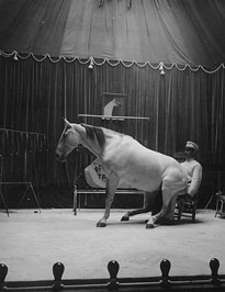 When Chambeau Blau died of equine fever in 1971, newspapers proclaimed the end of an era. Blau was the last and best of the horse hypnotists. At right we see Blau with the horse named Billy. Billy was more mule than horse, but he was Blau's favorite subject. Blau died in Copenhagen during an afternoon performance in the gardens of the Tivoli. Billy, still in a deep trance and despite the best efforts of Denmark's most skilled veterinarians, was humanely dispatched with a single gun shot. Billy was buried near the Viking memorial located in Amalienborg Square not far from the present Royal Residence. Blau's remains were returned to Maoam where he was buried amid considerable pomp and ceremony. Blau may have been the last living descendant of a distinguished line of persons begun by Robert Clef, the celebrated inventor of many mechanical novelties and the author of the medieval classic, Light & Virtue Through Observation of the Differential Gear. |